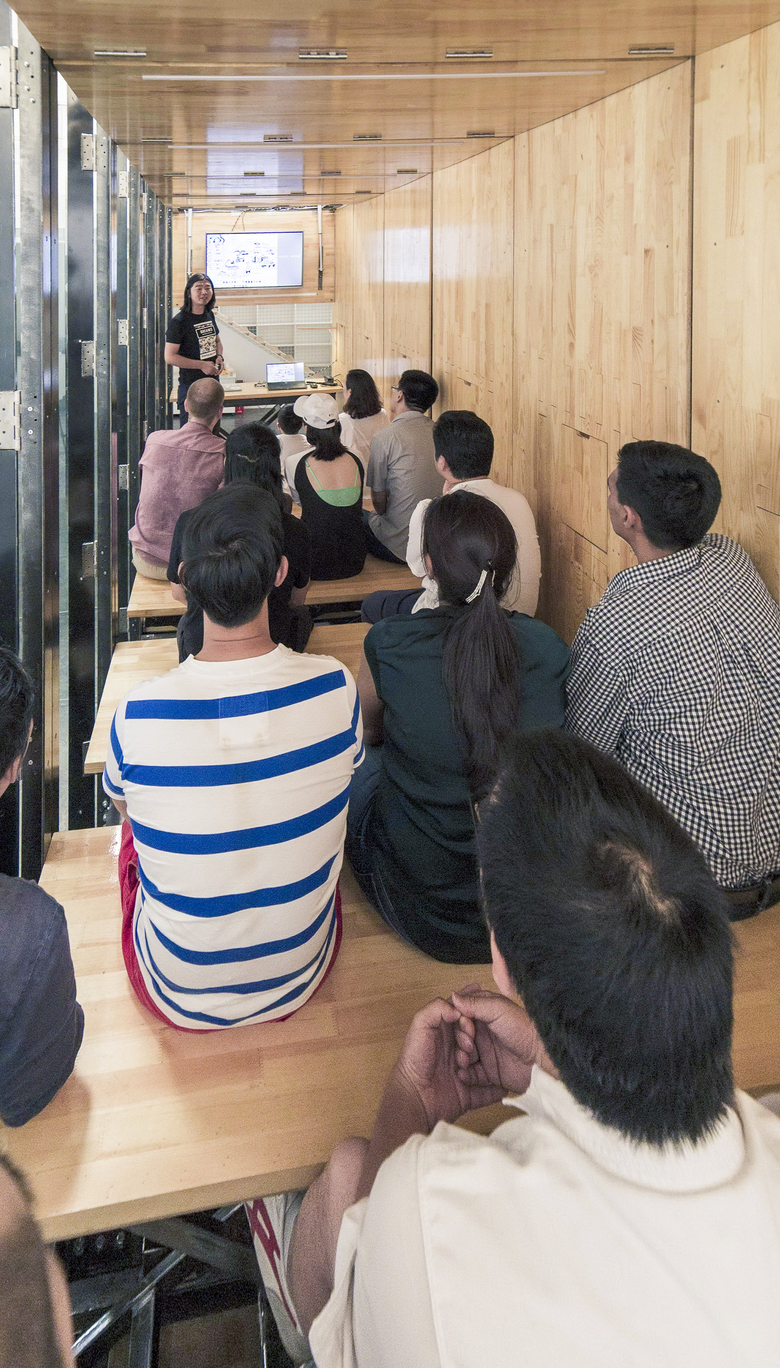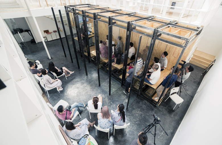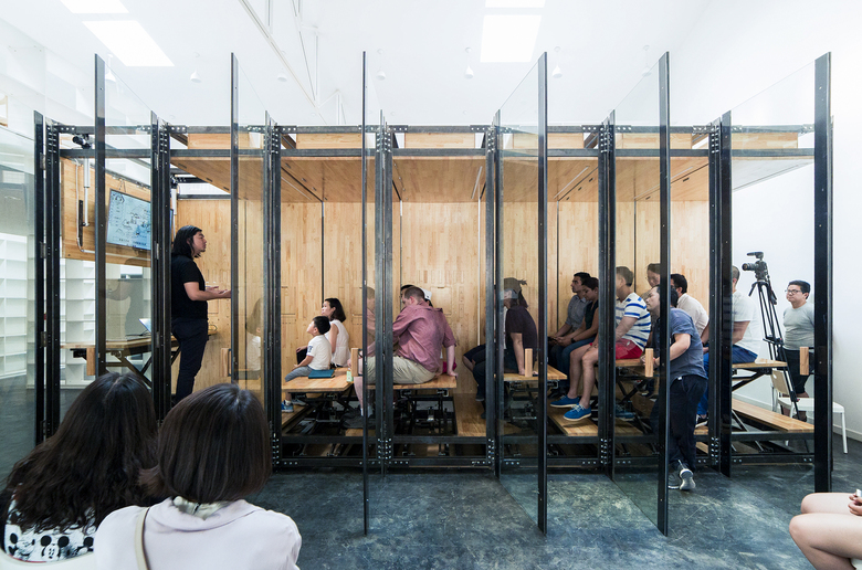9.639平米,这是比一间普通卧室还小的面积数。它也可以是:12个工位的办公桌台,18人的会议室,28人观看的小型展厅;集成了办公、会议、交流、展示、电路、灯光、储物需求。同时也可是一个微型展览空间,一个阶梯沙龙交流空间;它是一个小建筑、一个大家具、一个大电器。