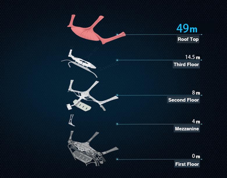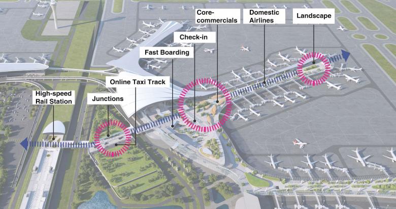 By adopting a three-fingered corridor structure surrounded by arcs, the terminal will maintain an overall harmonious layout in its connections to the T1 and T2 terminal areas while increasing the number of passenger seats near the aircrafts. Upon entrance, passengers will encounter a large, uninterrupted ground floor that provides direct access to the subway, automobile road and other methods of transportation connecting the terminal to the larger site.