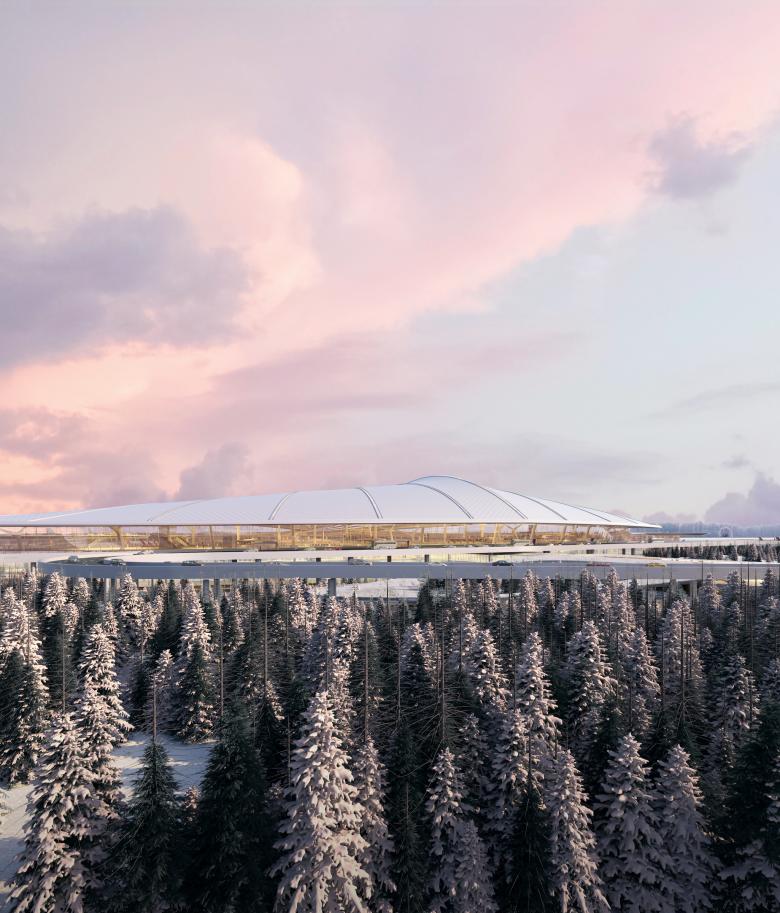 Natural light is brought into the departure hall through the feather-shaped roof to create a bright and warm interior space that provides much-needed sunlight to the garden spaces within. The structural system continues the rhythm of the building's skin to express the logic of force transmission, which converges toward the center together with the skylight, guiding the direction of passengers naturally. The unique wooden ceiling also combines with the structure, skylight and sunlight to create a dynamic interior space.