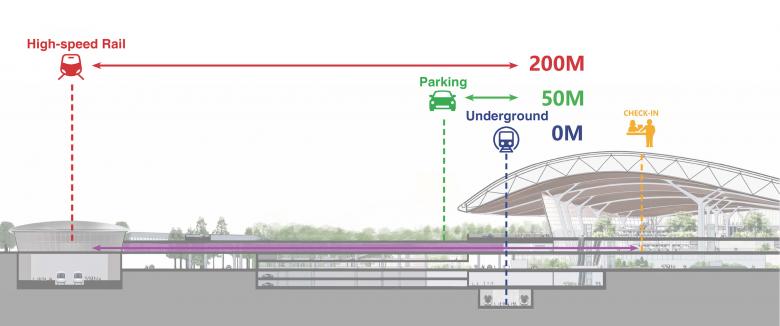 Additionally, passengers arriving without checked baggage will benefit from smart airport facilities such as self-service check-in machines and smart security checks. The overall spatial layout will save land and reduce the amount of earthwork, while the roofline uses height differences to reflect the cross-connections of different transportation modes from above.
