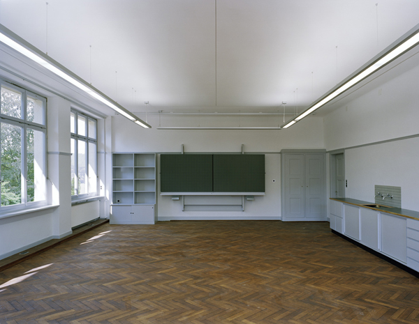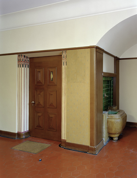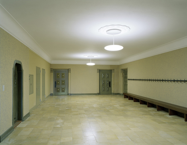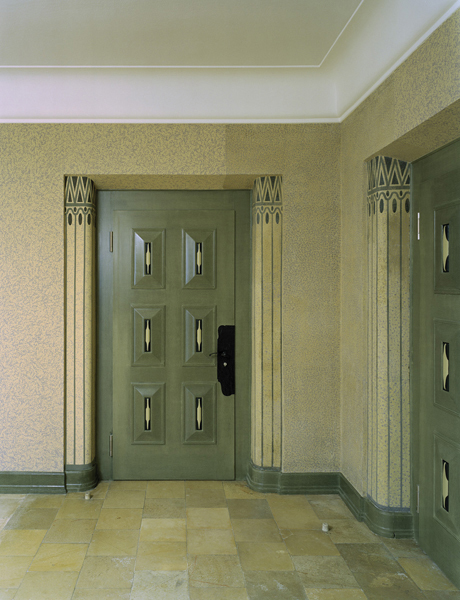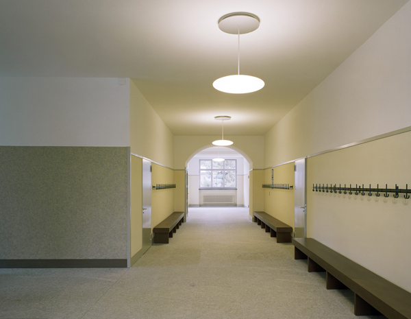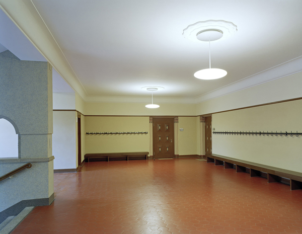 Aus denkmalpflegerischen Überlegungen erfahren die Korridor- und Foyerzonen eine Rückführung in ihren ursprünglichen Zustand. Hier wurde der ursprüngliche Tupfenanstrich wieder appliziert, die Türleibungen und die Holzmaserierung an den Türen nachgebildet.