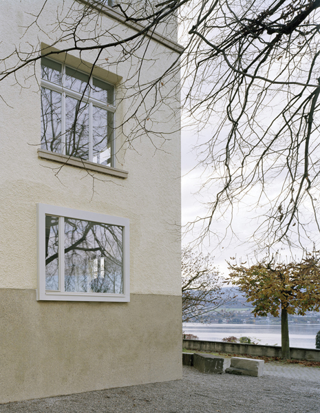 Die beiden, in den achtziger Jahren erstellten seitlichen Dachlukarnen werden entfernt. Die Dimension der neuen, symmetrischen Dachlukarnen wird minimal gehalten. Verkleidet in Kupferblech wird eine möglichst geringe Störung der dominanten Dachfläche beabsichtigt. Um die ursprüngliche Hierarchie und die Akzentuierung der Mittelachse zu erhalten, sind die neuen Dachaufbauten gegenüber der originalen Mittellukarne in der Flucht leicht zurückversetzt.