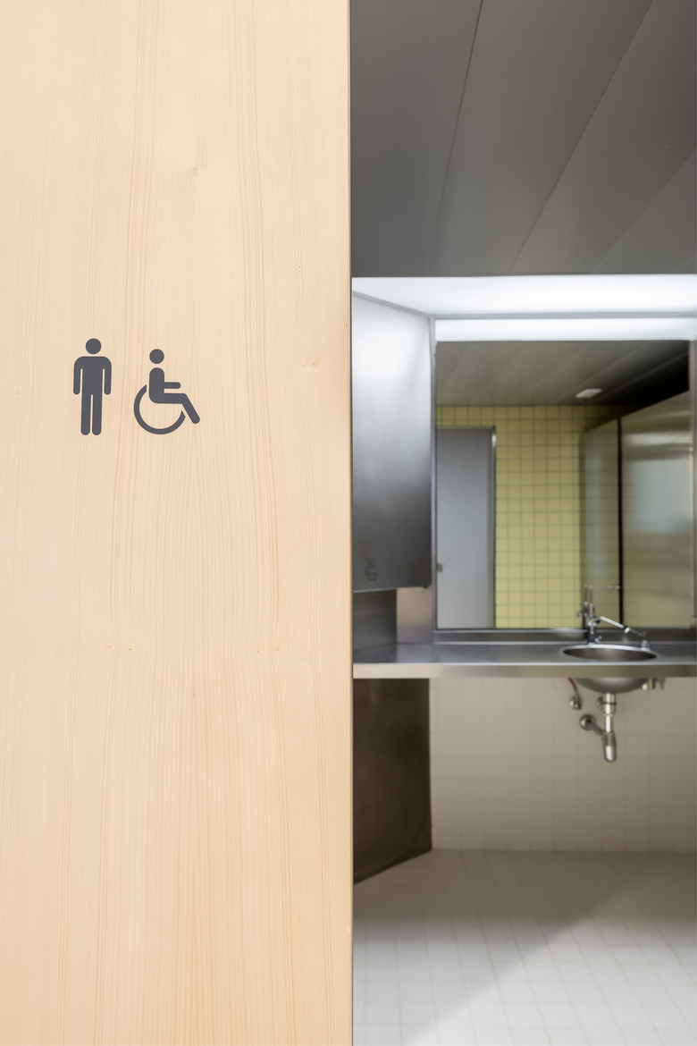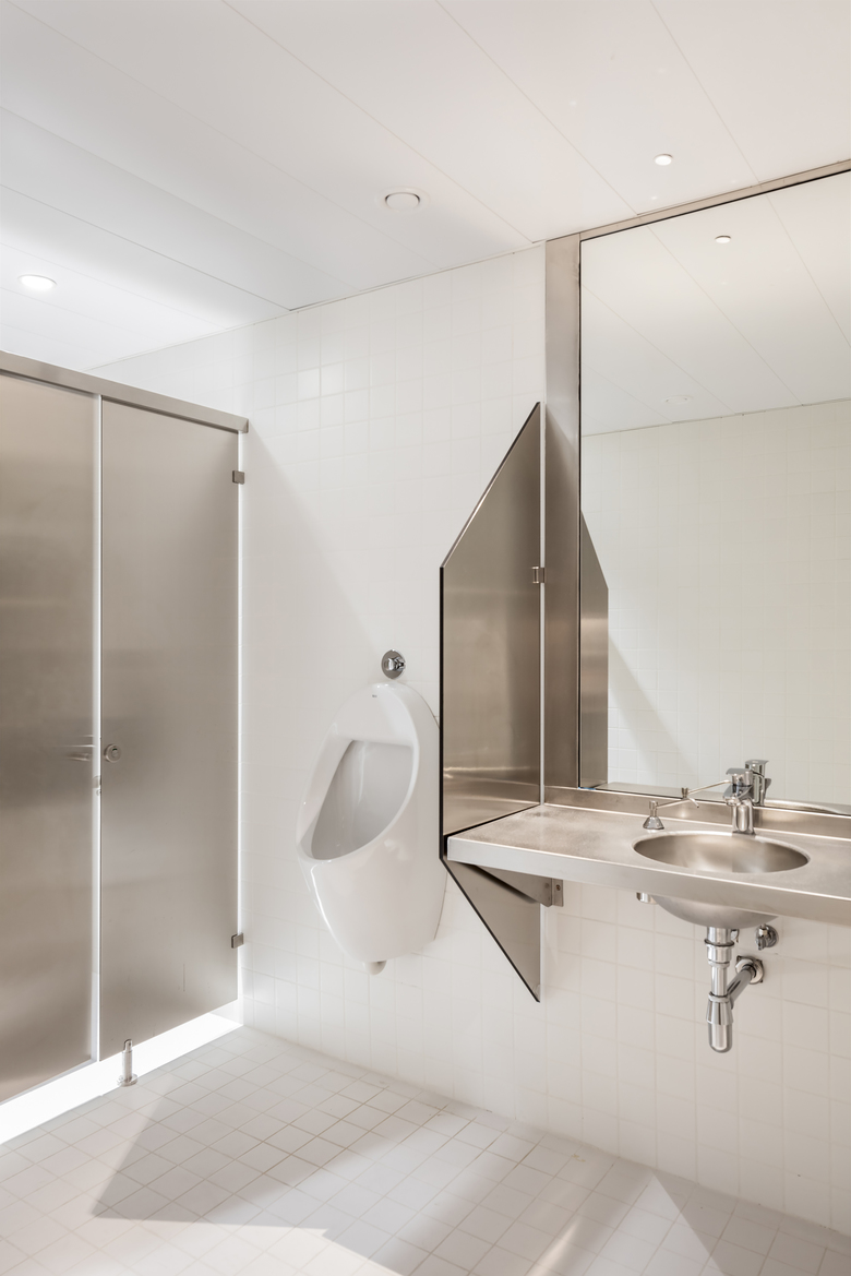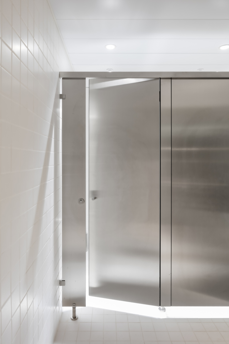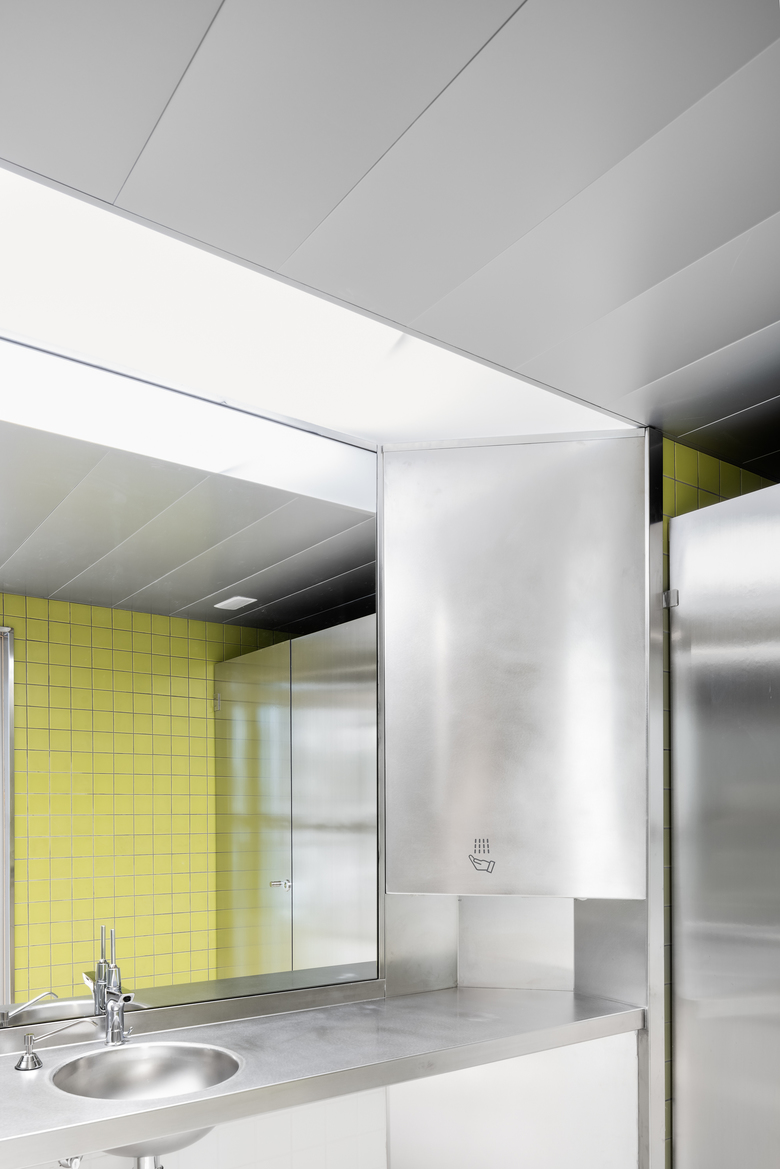 The restrooms, technically sophisticated to maintain the apparent simplicity in the finishes.