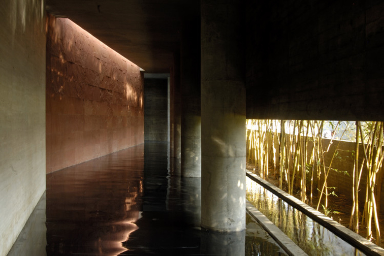 As one enters, an encounter with a large entrance veranda immediately shuts out the view of the outside, leaving behind bamboo, water and shafts of light on the rough walls overflowing into the house from the low height openings. The formal living-dining space as well as the adjoining pavilion overlooking a line of almond trees can be accessed from here. The formal entrance is across the passage from the family entrance, both in close proximity to the kitchen which is placed on corner assuming an important position in this type where the lady of the home supervises the cooking. The staircase next to the living space and kitchen takes us to the private areas and a study above those on the ground floor, a patio and another pavilion overlooking the courtyard below.