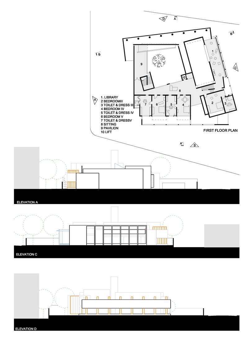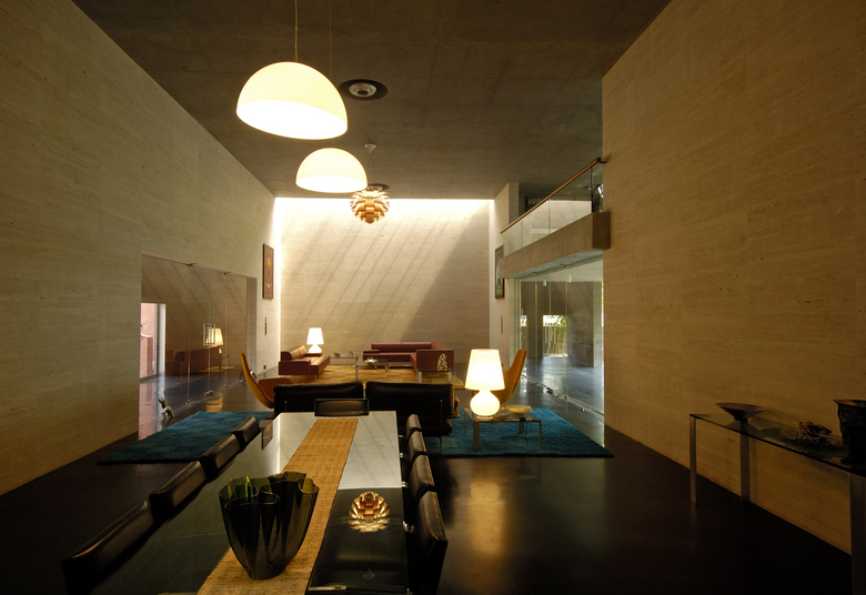 In the heart of the industrial city of Surat; with a recent history of plague, riots, earthquake, and floods; and dealing with the side effects of industrialization, is the 2650 square meter oddly shaped plot for housing a migrant diamantaire, his textile designer wife, two sons, and aging parents; and a large collection of art. The challenge was to provide the family a space into which they could retreat and not become a spectacle for the high-rise buildings all around.