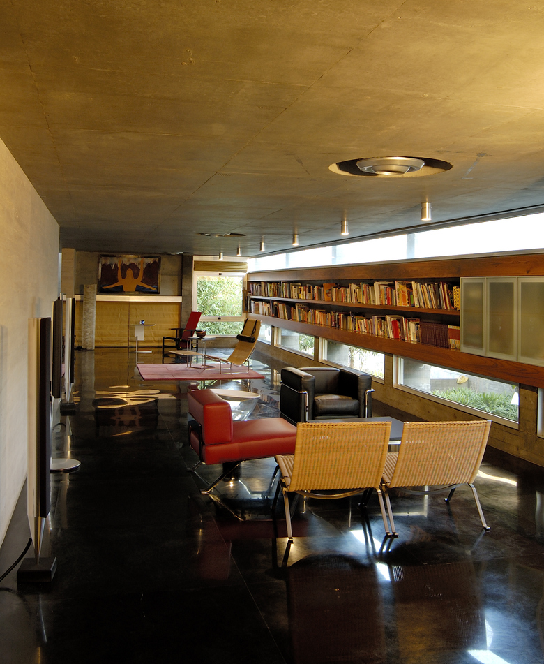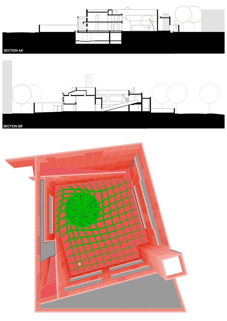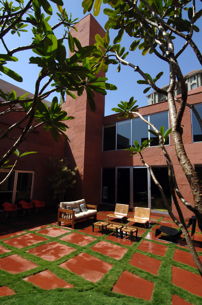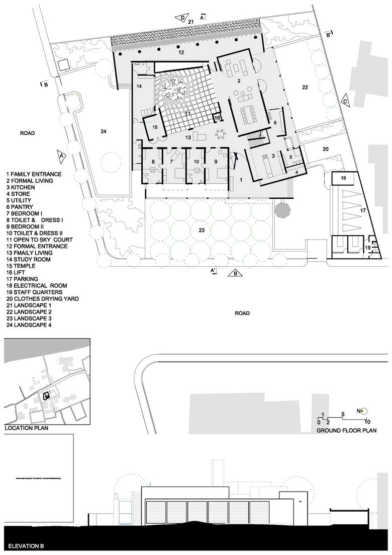 The spatial resolution is attained by composing the court with a ramp, a stair and a lift on its four corners. All radiating site lines converge on a lone frangipani tree in the courtyard. This tree acts as the navel – ‘the cosmic axis of energy concentration’.