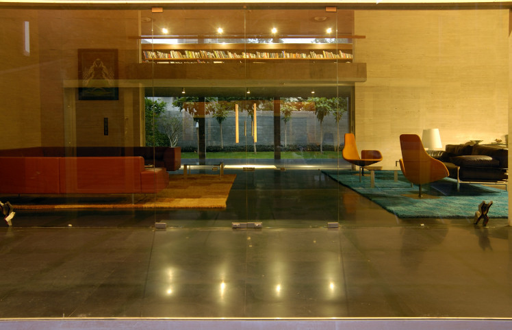Back downstairs, the overlapping of individual family member’s routines converge around the courtyard creating a space at the centre of the house which often becomes the hub of family life. The lady of the house moves between the Burma-teak-clad bedrooms and the kitchen; while her husband attends to his associates and guests in the travertine-clad drawing room with its outdoor veranda overlooking the tranquil green behind the house. The older grandson enjoys the water-filled all-concrete subterranean Jacuzzi with his friends, while his grandfather spends his evenings near the lift enjoying the gentle draught of the air rising towards the heated lift tower. The grandmother relaxes in the family veranda keeping an eye on the youngest grandson who plays in and around the red sandstone court, owning the house the most.
