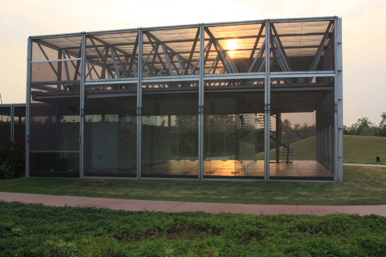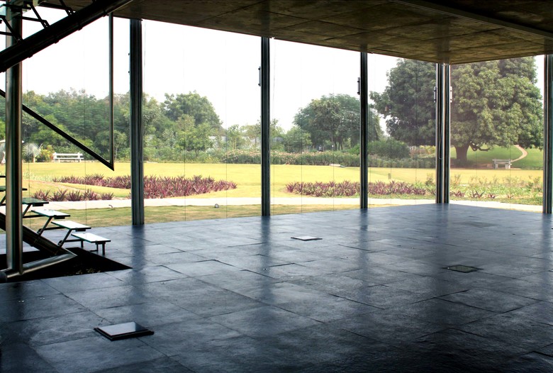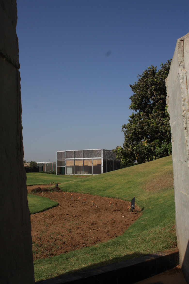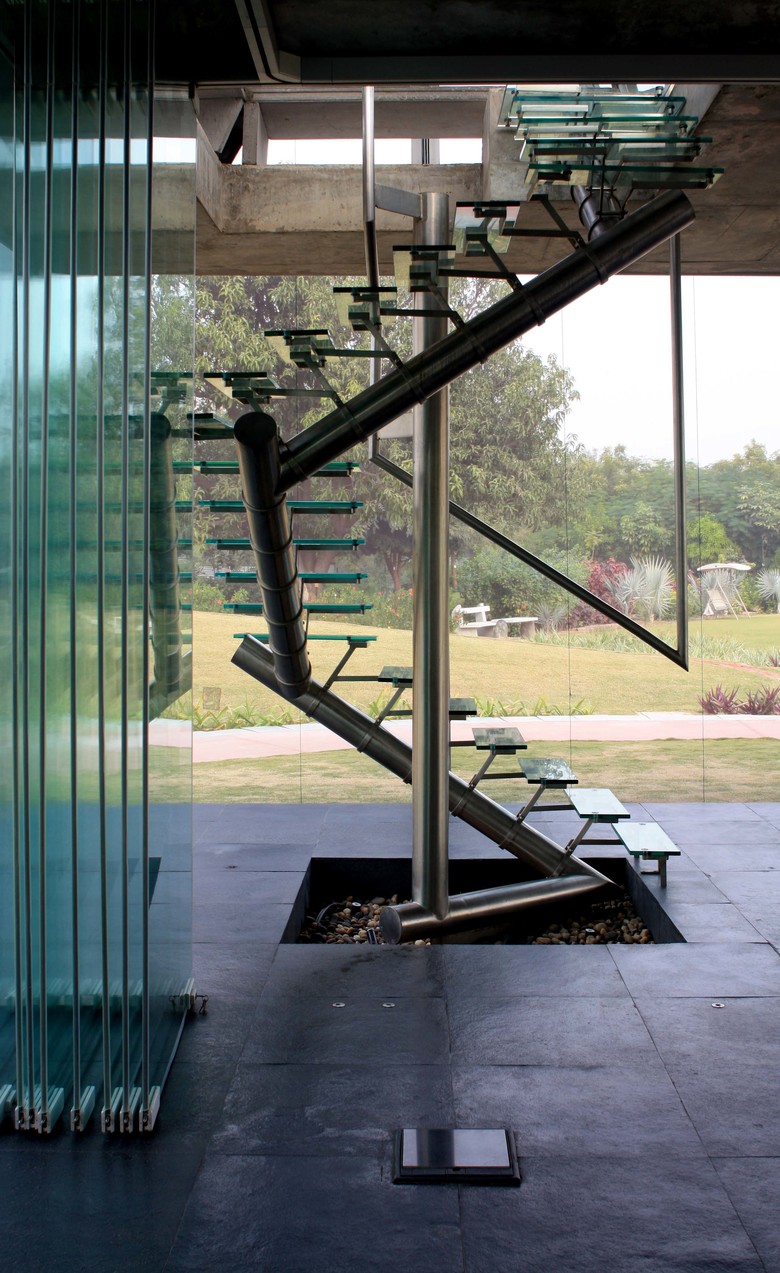Though less prevalent today, in our childhood we slept outdoors under a simple net held up by intersecting poles which, once we tucked in, became our private domain, a safe haven. When the brief for a weekend house in the fringes of the city asked for a place that is open to nature yet shields you from its harsher aspects, memories of the net and the protection it offered came to mind. A virtual jungle of hoardings, telecom towers and temporary structures now make up the Indian city skyline. This same image reverberates in the light composite steel and concrete hand fabricated trellis that holds up the hovering slab and leaves the floor below free.