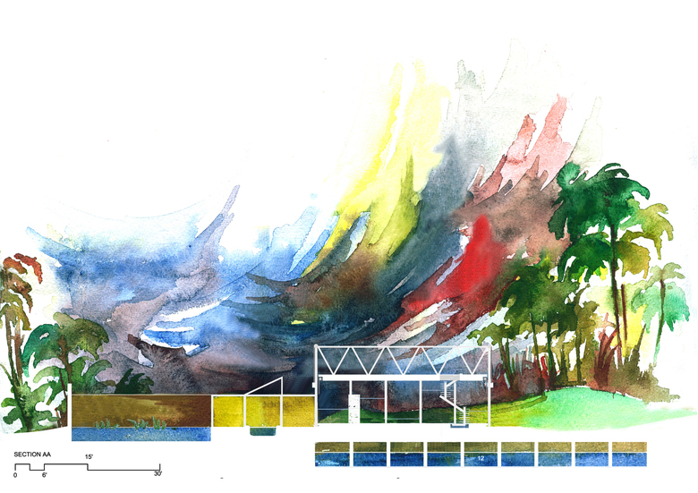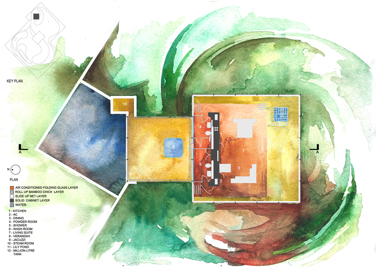 bamboo chiks to provide shade from the hot tropical sun and glass so it can be air conditioned. All these layers providing desired degrees of privacy, shelter and exposure to nature, resulting in the NET HOUSE.