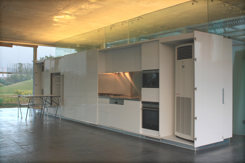 Centred around an all encompassing cabinet the 12 m x 12 m column less space thus formed is enveloped in gossamer layers of mosquito net to protect from insects,