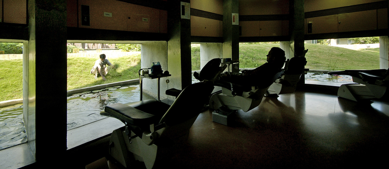 The project has specifically dealt with restrictions of space and economy. The costs have been kept abysmally low by custom designing and locally fabricating all doors, windows, modular furniture including steel work stations, press metal storages, double glazed partitions, even door handles. Moreover, the Architect’s Scope of work included certain product design items like the auditorium chairs and fully automatic donor chairs, hot and cold-water dispensers, compact cold room blood stacking & identification system & moving ladders for cleaning glass, even two specially designed blood donation vans. Large fixed furniture like conference, reception and pantry tables are all set insitu concrete as also the 5 m long entrance gates. The staircases are composed of precast concrete units. The false ceiling and acoustic paneling in auditorium is in lightweight concrete with insulating vermiculite. All the wooden planks used for exposed form work was salvaged and was later used for the auditorium staging. Rainwater is collected and directed into percolation tanks and the water body is a self-sustained ecosystem with Koi fishes and water lilies. (Photo 6)The project was completed in 12 months and was built at a cost of under $200 per SqM., including civil, electrical, plumbing, air-conditioning, interiors and site development.