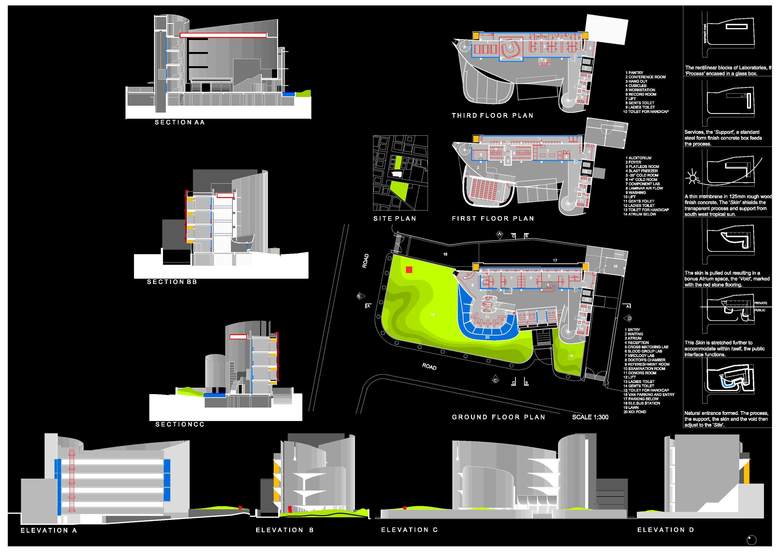 The plan is an outcome of a rational step-by-step intervention that resulted in the basic defining lines.The exterior ‘Skin’ that presents an image of ‘the simple and one’, disintegrates into sub spaces as soon as the entrance ushers one into a fourstorey ‘Void’. From this buffer, one becomes visually conscious of the activities carried out. The glass wall disappears showcasing the complete ‘Process’, (Photos 7)Highlights like the Blast Freezer, Conference room and a Hangout balcony are further accentuated by protruding them out of the glass wall. Standing mute and staid, The ‘Support’ block of services, silently feeds the Process with its requisite demands. The building stands manifested in its intrinsic nature within and an object rooted in nature without.