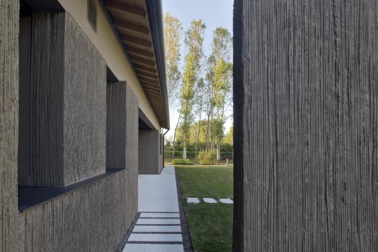 i muri esterni in calcestruzzo a vista sono caratterizzati da una superficie grezza ottenuta mediante un particolare cassero, che ha impresso come un fossile la trama del tipico canneto che nasce spontaneamente lungo i canali della campagna veneta.