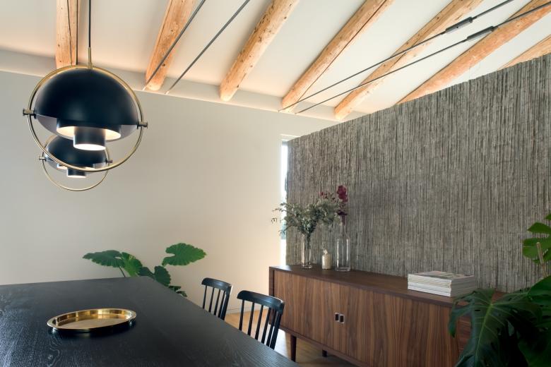 La copertura del corpo principale dell’abitazione è realizzata con travi di legno recuperate dalla demolizione dei solai di antiche ville venete, re-impiegate in un sistema costruttivo contemporaneo.