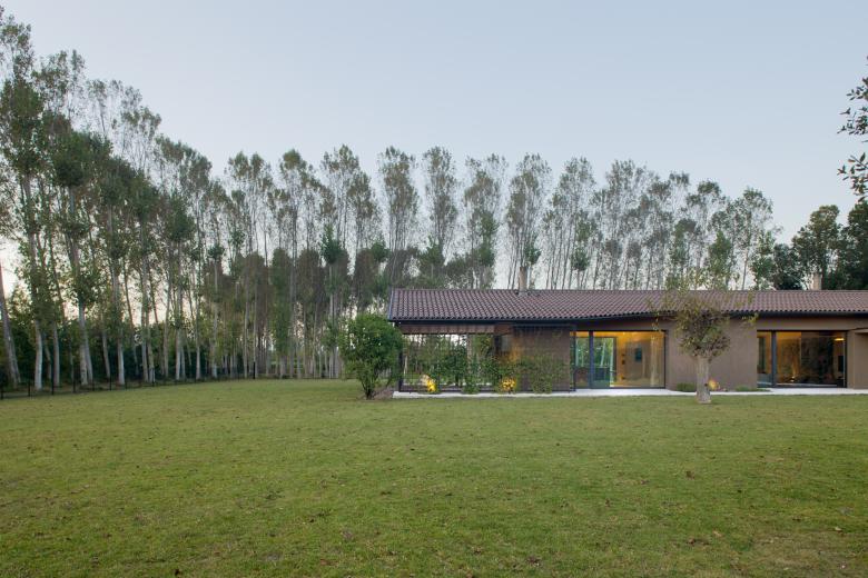 Il lotto d’intervento, lambito da un corso d’acqua, grazie alla sua generosa estensione permette all’abitazione di svilupparsi su un unico piano con copertura a due falde.