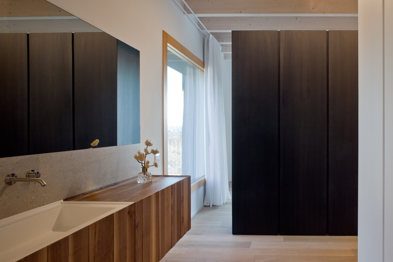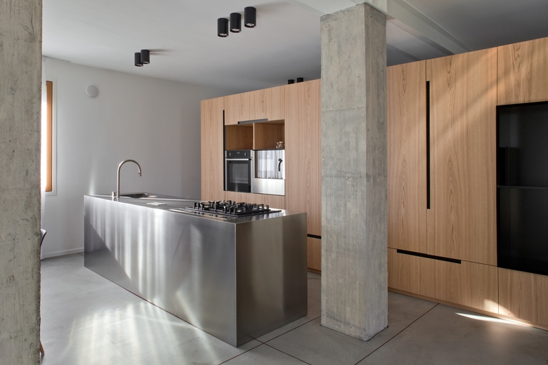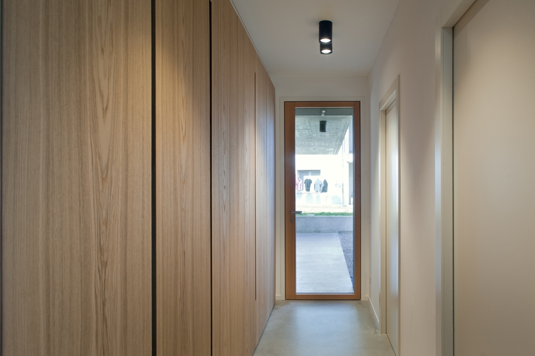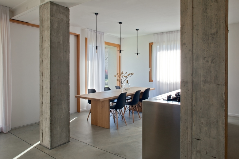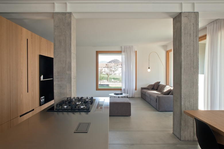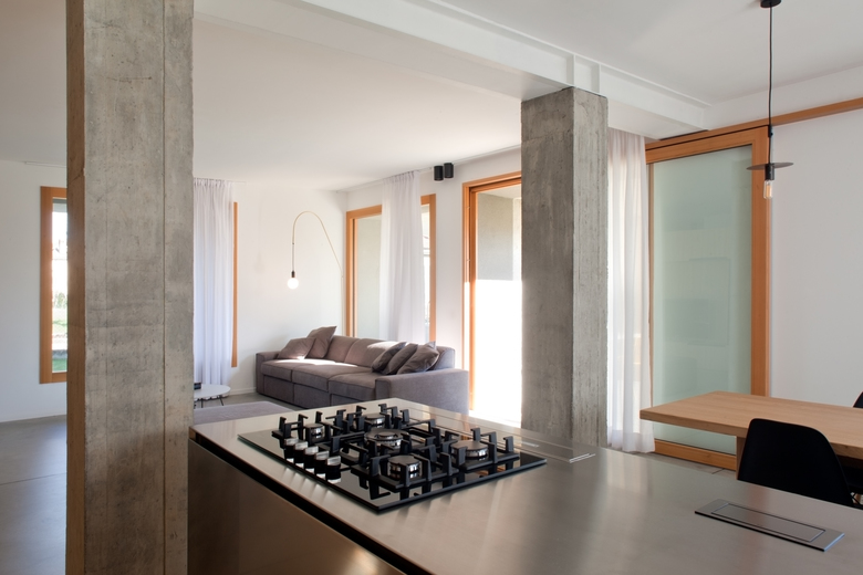 Dall’ingresso principale, collocato lungo il lato est, si accede all’ambiente principale della casa, dove una parete attrezzata in legno naturale definisce e organizza la divisione degli spazi, mascherando al suo interno diversi elementi di servizio. La pavimentazione in calcestruzzo lisciato del piano terra, favorisce un approccio di continuità tra interno ed esterno; lo stesso materiale è stato impiegato per realizzare i nuovi pilastri di consolidamento statico, mantenuti “faccia a vista” al fine di dichiararne la natura strutturale.