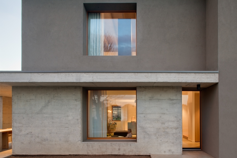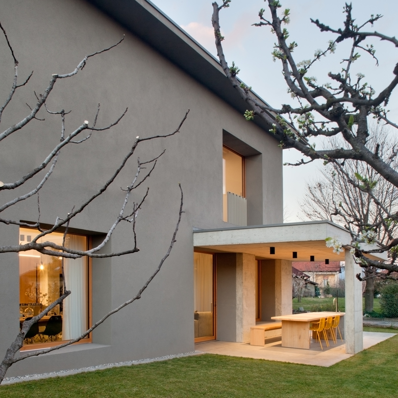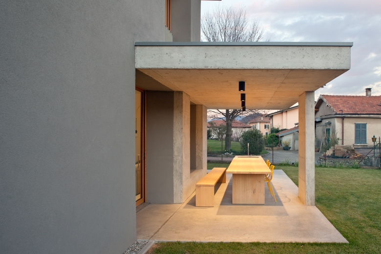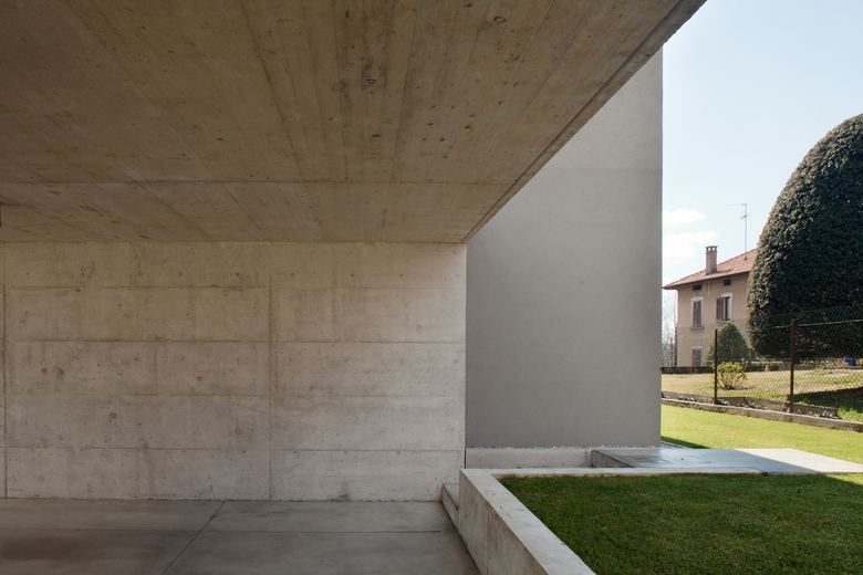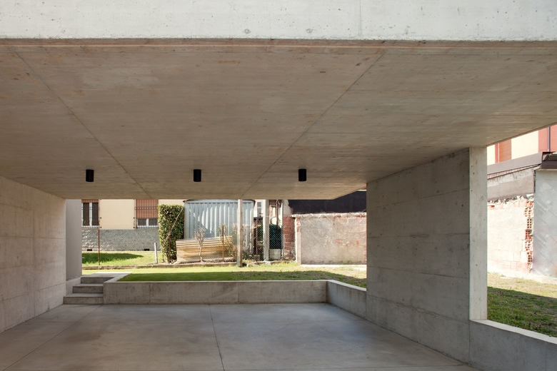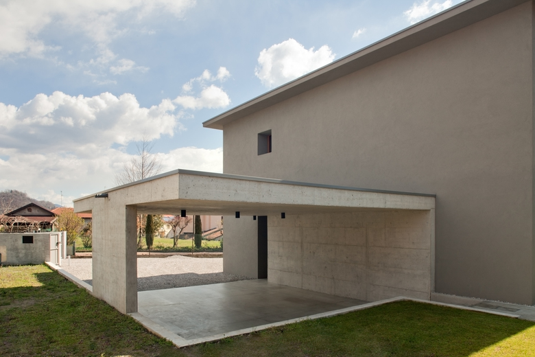 Nella parte a Nord del piano terra sono stati collocati gli spazi di servizio e lo studio, prevedendo un accesso secondario in corrispondenza del posto auto, protetto da un portico in calcestruzzo.