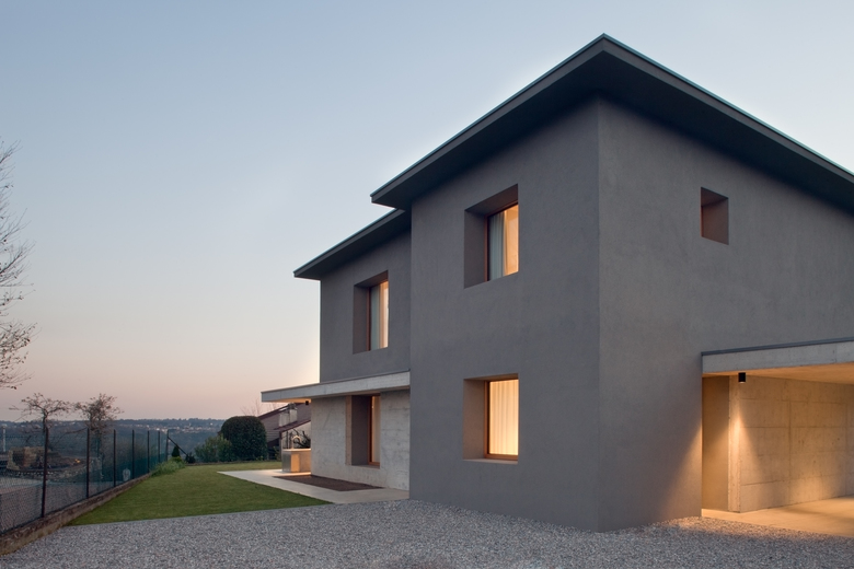 Le nuove ampie aperture inquadrano il paesaggio collinare circostante, favorendo l’illuminazione naturale degli ambienti durante il giorno. Un secondo portico in calcestruzzo faccia a vista individua e protegge l’ingresso.
