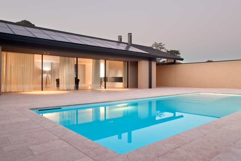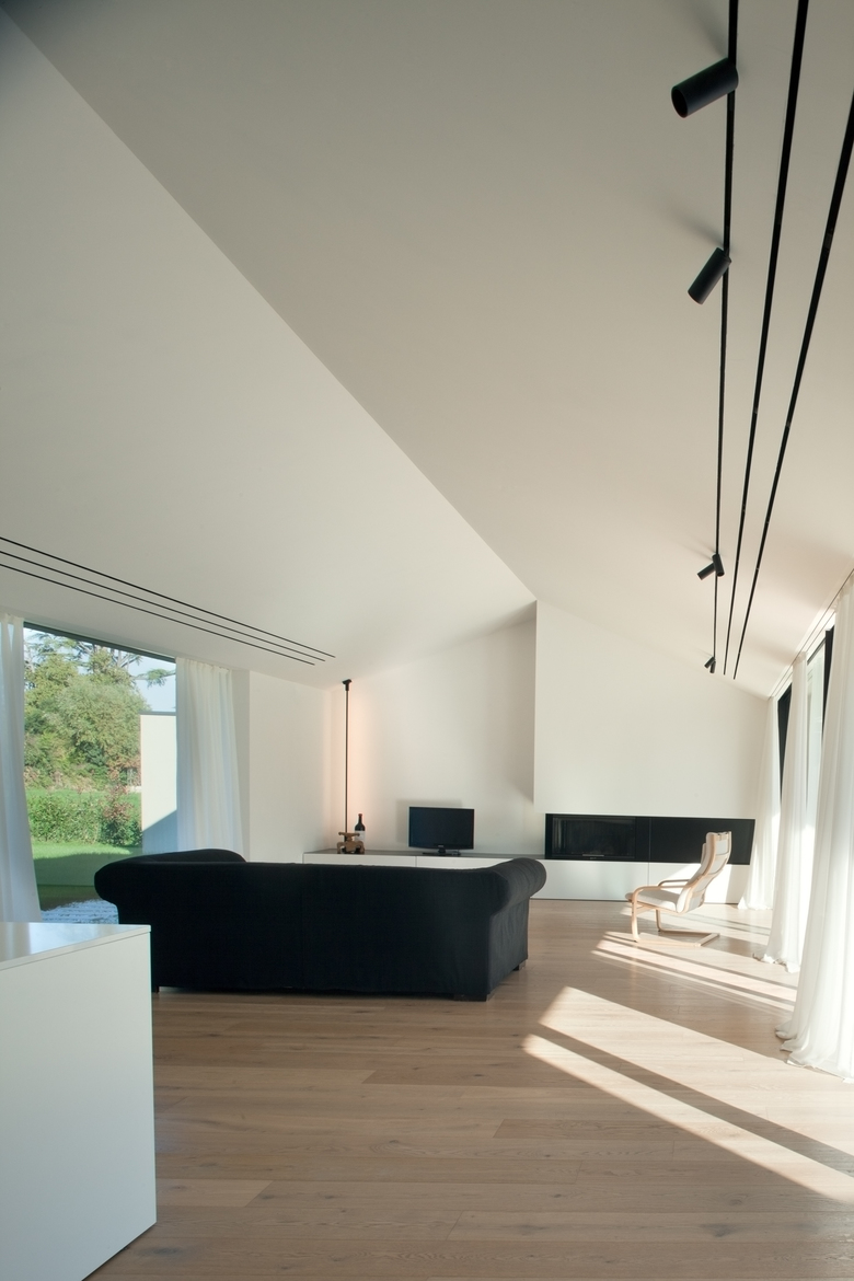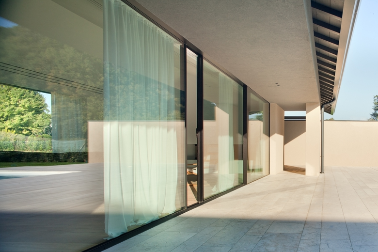 La configurazione del lotto permette l'orientamento ottimale dell'edificio, composto da due volumi regolari e perpendicolari tra loro: la zona giorno esposta nord-sud, mentre la zona notte, è orientata est-ovest; nell'intersezione tra i due blocchi trovano posto i locali tecnici, di servizio e gli spazi per gli ospiti. Lo spazio della zona giorno, grazie alle grandi vetrate poste a nord e a sud, è visivamente dilatato verso i due grandi giardini prospicienti, permettendo la visione delle colline circostanti e di Villa Serenella.