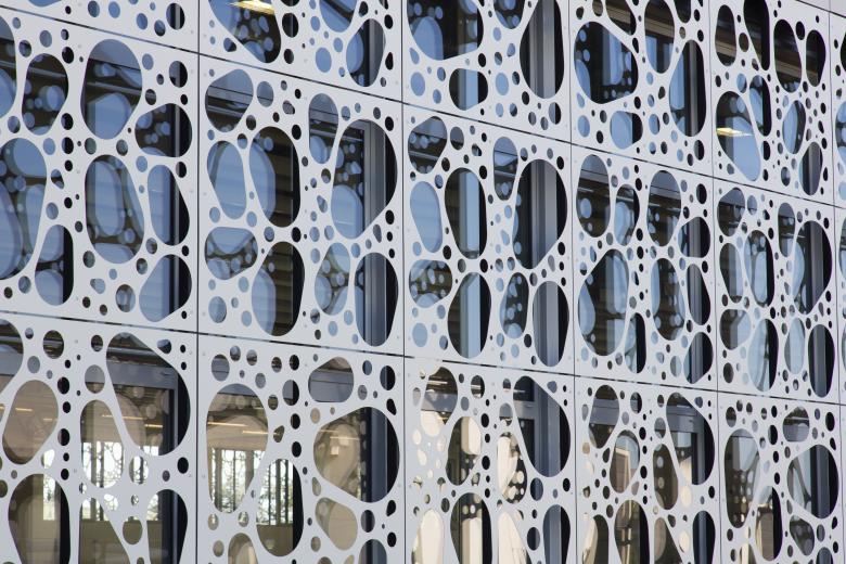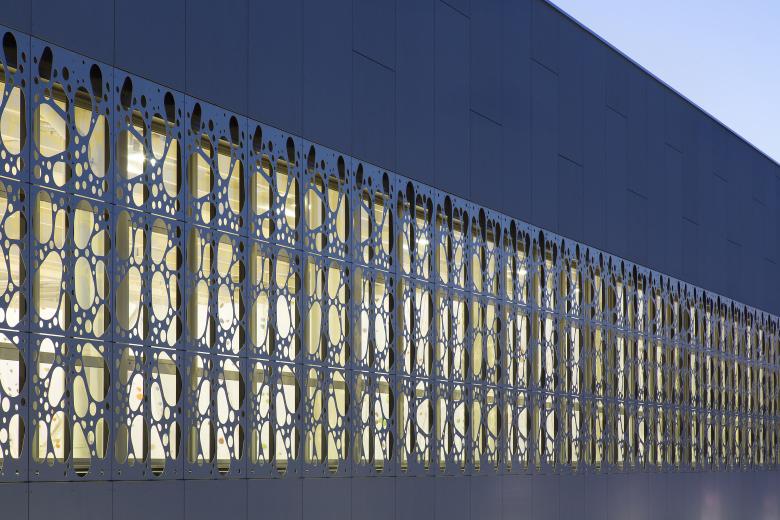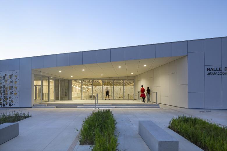 Un des enjeux majeurs de l’opération réside donc dans sa capacité à générer de l’urbanité. Ainsi le parvis joue un rôle primordial, pensé comme une place urbaine, il se veut homogène dans sa représentation, unissant les éléments piétonniers tout comme les zones de stationnement. Entièrement vitrée, l’entrée de la halle de sports offre une transversalité visuelle depuis le parvis directement vers la zone de jeux. La nuit, elle constitue un signal pour les visiteurs.