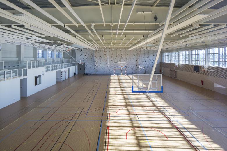 L’ambiance de la salle de sport se veut elle aussi confortable et accueillante favorisant des couleurs claires pour ne pas gêner la vision du jeu tout en fabriquant une ambiance chaleureuse grâce à l’utilisation du bois. L’apport de lumière naturelle est essentiel à un fonctionnement sain de la halle de sport, c’est pourquoi le gymnase est éclairé grâce à des lanterneaux en toiture et par la façade ajourée procurent une ambiance et des conditions de jeu optimales.