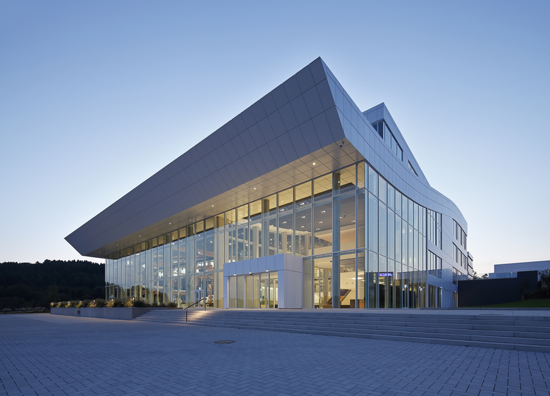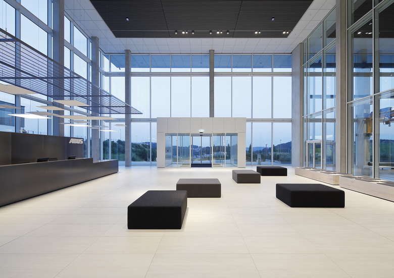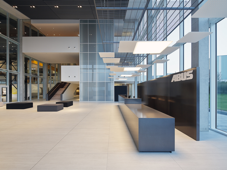 Weltweit führend, und doch regional verwurzelt – so präsentiert sich die ABUS Kransysteme GmbH aus Gummersbach. Besucher und Mitarbeiter betreten das Gebäude über ein großzügiges Foyer, das über mehrere Stockwerke den Blick in die Kranhalle freigibt und durch seine puristische und lichtdurchflutete Atmosphäre besticht. Als Beleuchtungselemente und zur Optimierung der Raumakustik setzte das Düsseldorfer Innenarchitekturbüro raumkontor über dem Empfangstresen Rossoacoustic PADs, kombiniert mit Project Leuchten von Nimbus ein. Den Planern gefiel dabei besonders die „gelungene, effizient und gut gestaltete Kombination von Beleuchtung und Akustikpaneelen“. Insgesamt legte das erfahrene Büro überall im Haus Wert auf eine Ehrlichkeit der eingesetzten Materialien. Die Planer wählten für die Ausgestaltung vieler Raumszenarien traditionelle, regional geprägte Elemente, die über eine Neuinterpretation originell und detailreich in die Jetztzeit geholt wurden. Über die Raumgestaltung hinaus war das Büro auch für die grafische Gestaltung vieler Elemente verantwortlich.