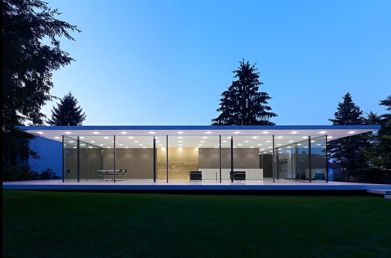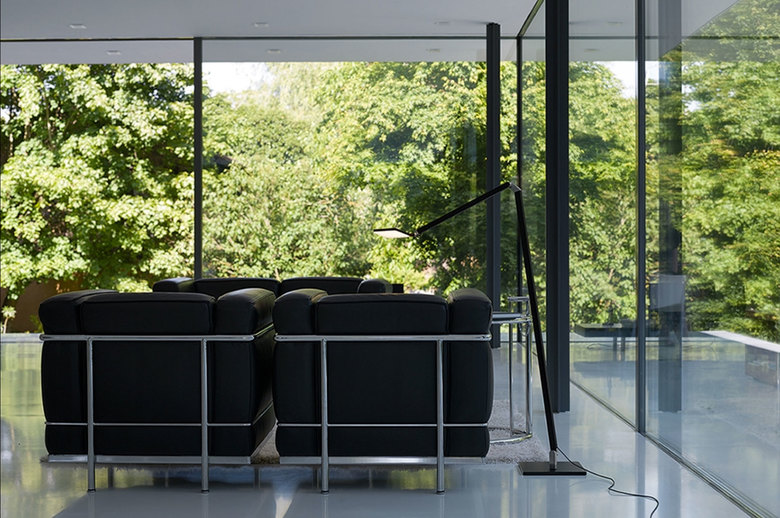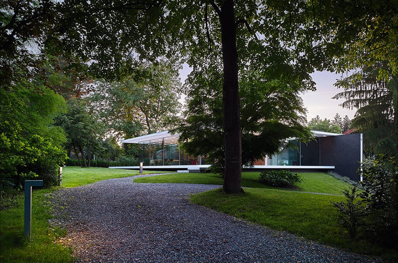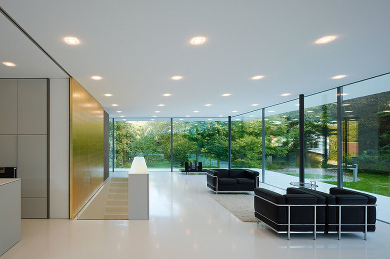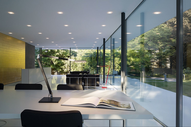 Saftiges Grün, große Bäume, eine weite Rasenfläche, der Gang der Jahreszeiten. Umgebende Natur und Wohnraum fließen sich bei diesem klar strukturierten Wohnhaus förmlich entgegen. Der kaum wahrnehmbare Übergang zwischen Innen- und Außenraum ist typisch für die bekannten Wohngebäude von Architekt und Ingenieur Werner Sobek. Und so kam es ihm entgegen, dass die im Innenraum in einem regelmäßigen Raster eingesetzten Q 36 LED-Leuchten auch in einer spritzgeschützten Variante unter dem Zusatz “Aqua” im Portfolio von Nimbus geführt werden. Die Beleuchtung ließ sich so optisch nahtlos in den weit auskragenden Bereich der Deckenscheibe fortsetzen. Ein von Werner Sobek entwickeltes Energiekonzept, Triple Zero, macht D10 zu einem wegweisenden Projekt und konnte hier komplett umgesetzt werden. Triple Zero meint: null Energieverbrauch, null Emissionen, null Bauabfall. Es handelt sich um ein Nachhaltigkeitskonzept für Gebäude, das garantiert, dass der komplette Energiebedarf des Hauses über regenerative Energien gedeckt wird. Ein Geothermiesystem mit Wärmepumpe deckt den Heiz- und Kühlbedarf des Gebäudes und sorgt für die Warmwassererzeugung. Zusätzlich erzeugt eine Photovoltaikanlage im Jahresdurchschnitt sogar mehr Energie, als das Gebäude verbraucht.