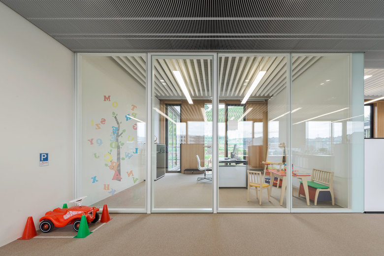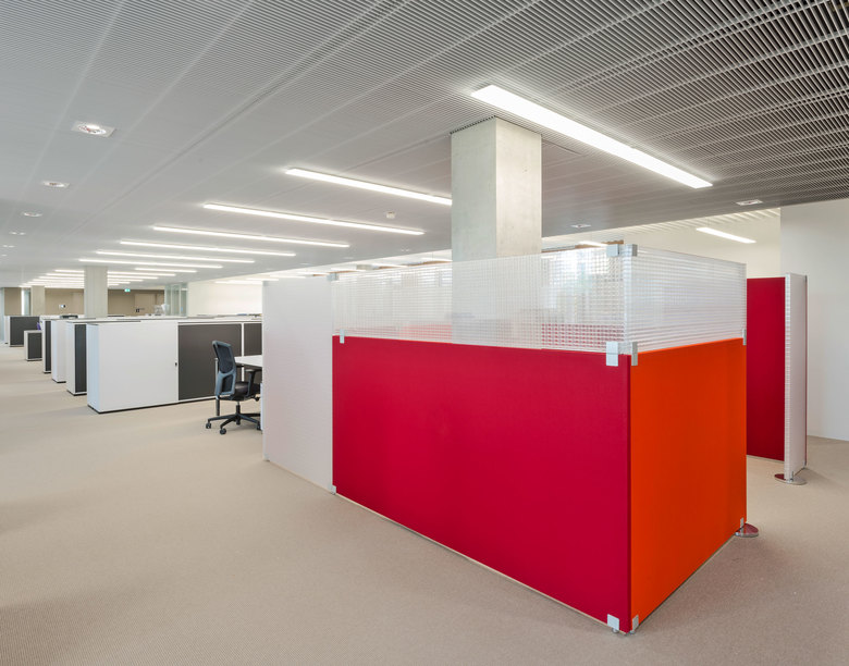Neben Sichtbetonwänden und Putzflächen prägen vor allem natürliche Materialien das Bild: Muschelkalk, Sandstein und Eichenholz. In den Großraumbüros springen aber vor allem die über 100 Rossoacoustic TP30 Knit Paneele der Nimbus Group ins Auge. Sie wirken schallschirmend und -absorbierend und erzeugen zusammen mit den an der Decke angebrachten Akustikmaßnahmen eine ruhige, produktive Arbeitsatmosphäre. Die Rossoacoustic TP30 Knit Paneele schirmen aber nicht nur gegenüber liegende Arbeitsplätze voneinander ab oder zonieren Besprechungsinseln. Sie bringen auch Farbe ins Arbeitsleben: Die Textilpaneele mit ihrem integrierten Akustikvlies sind in 17 verschiedenen Farben erhältlich und lassen daher kaum einen Wunsch offen. In den vergangenen Jahren hat die Nimbus Group Rossoacoustic zu einem flexiblen Baukastensystem erweitert. Neuartige Beschläge aus der Team-Serie ermöglichen es, die farbigen Rossoacoustic TP30 Knit Paneele und die lichtdurchlässigen Rossoacoustic CP30 Paneele miteinander zu kombinieren. Genau das ist bei den zonierten Besprechungsinseln in den Großraumbüros der IHK Region Stuttgart der Fall. Bei Bedarf lassen sie sich jederzeit umgestalten und den geänderten Bedürfnissen anpassen. Denn die Paneele sind federleicht und lassen sich dank der Beschläge völlig ohne Werkzeug in jeder denkbaren Konstellation neu zusammenstellen.