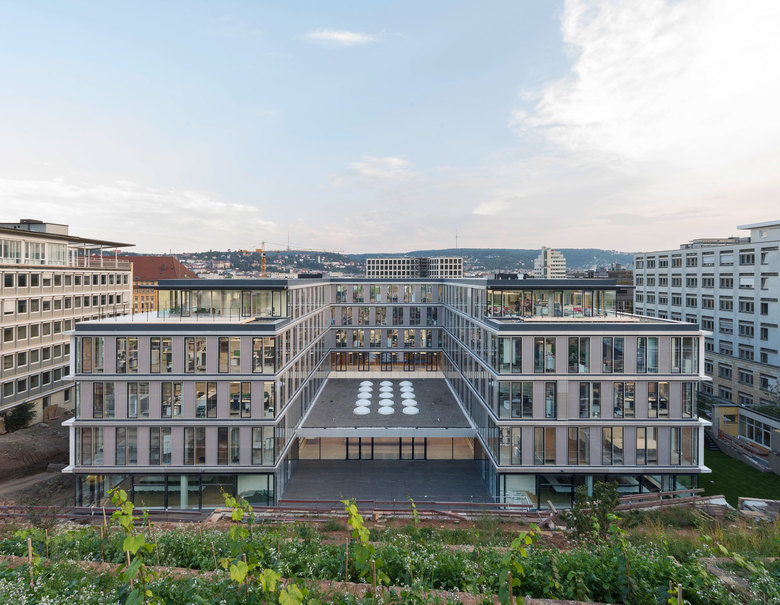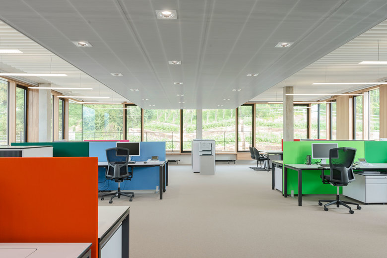 So etwas gibt es wohl nur in Stuttgart: Die neue IHK-Zentrale liegt mitten in der Stadt – nur einen Steinwurf vom Hauptbahnhof entfernt – und dennoch im Grünen. Der U-förmige Neu¬bau öffnet sich zu einem angrenzenden Weinberg, der auf diese Weise zu einem ständig präsenten Teil des Gebäudes wird. Auf der Straßenseite geht der Blick über den gesamten Talkessel. Im gesamten Gebäude kommen über 800 sparsame und hocheffiziente LED-Leuchten von Nimbus zum Einsatz. Diese gewährleisten ein ganztägig konstantes Helligkeitsniveau, weil sich die Steuerung der Beleuchtung automatisch dem Tageslicht anpasst. In den Großraumbüros wurden über 600 Langfeldleuchten L 196 und L 112 installiert, die zum Großteil über Modulverbinder zu langen, abgependelten Lichtbändern verkettet wurden. In den öffentlichen Bereichen und Verkehrswegen kommen die quadratischen Modul Q-Leuchten zum Einsatz und in der Cafeteria „Wolke Blau“ sorgen verschieden große Modul R-Leuchten für das richtige Kunstlicht.