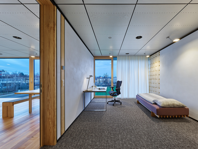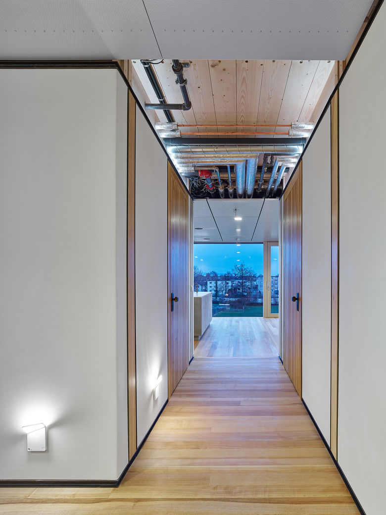 Bei der Beleuchtung fiel die Wahl auf Nimbus: Über 50 Nimbus-Leuchten, darunter ganz neu entwickelte Modelle, erhellen die Einheit, die als Wohnung für zwei Studierende dient. Als Pionier auf dem Gebiet der LED-Technologie hatte Nimbus von Anfang an ein großes Interesse am sparsamen Umgang mit Energie und Rohstoffen. Ebenfalls genutzt werden zum Beispiel neuartige Dämmplatten aus Pilz-Myzelium, innovative Recyclingsteine, wiederverwertete Isolationsmaterialien oder geleaste Teppichböden.