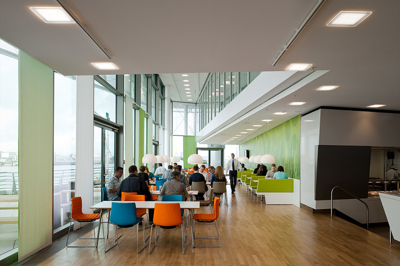 Hamburg Hafencity, Strandkai 1 – die beste Adresse in Hamburg, die man sich vorstellen kann: direkt an der Elbe, mitten im Jahrhundertprojekt HafenCity, das Kreuzfahrt-Terminal und die Fluss-Promenade nur ein paar Schritte entfernt, der Hamburger Hafen gleich vis-à-vis. An diesem Aufsehen erregenden Ort hat sich der Konzern Unilever Deutschland mit seiner neuen Firmenzentrale niedergelassen. Aber nicht nur die Lage ist einzigartig. Auch das von Behnisch Architekten, Stuttgart, entworfene Gebäude setzt in jeder Hinsicht Maßstäbe. Die sechs Ebenen umschließen das Herz des Gebäudes: das weiträumige, tageslichtdurchflutete Atrium, das in der Erdgeschossebene Passanten zum Bummeln und Verweilen in den Shops, dem Café und dem Restaurant einlädt. Gleichzeitig ist es für die fast 1.200 Mitarbeiter von Unilever der zentrale Ort des Austauschs: