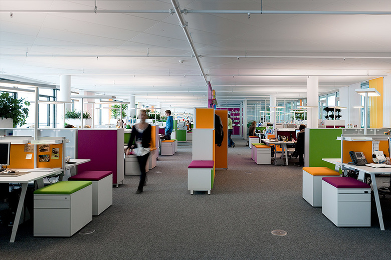 Licht, Offenheit und Transparenz prägen die Arbeitsbereiche, verbindende Elemente wie Treppen, Brücken und Rampen ermöglichen spontane und inspirierende Kommunikation.