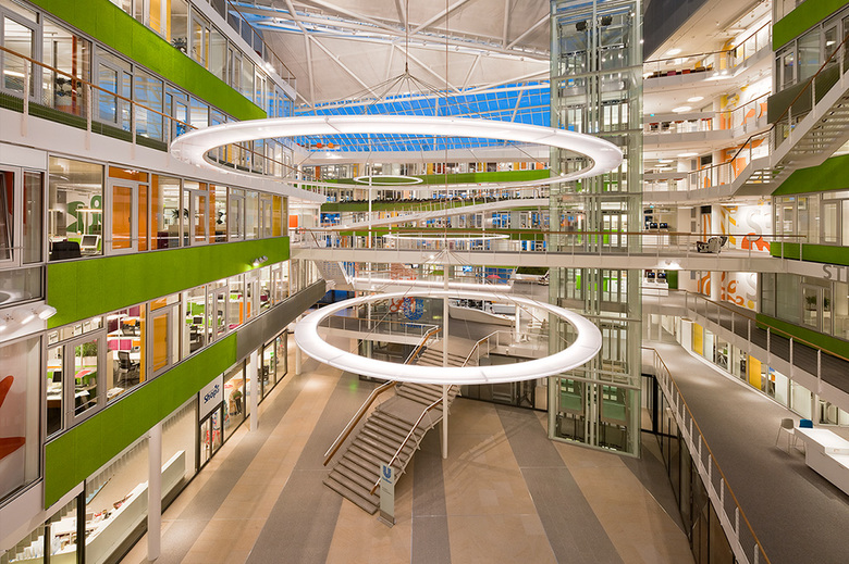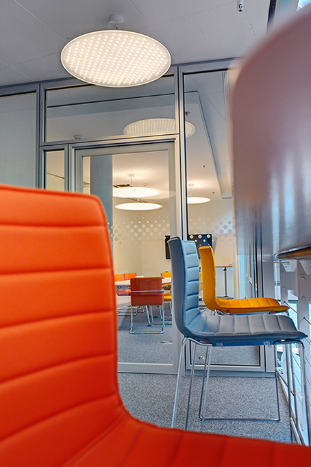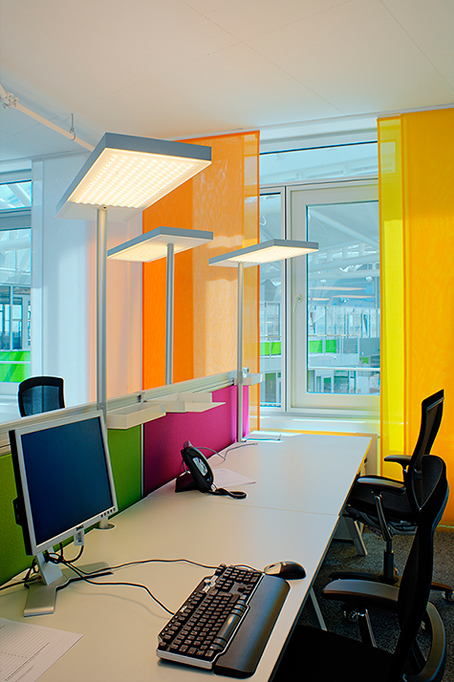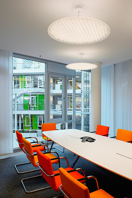 Zentraler Bestandteil des Gebäudes ist das Licht: Auf 35.000 Quadratmetern leuchten auf 6 Ebenen extrem energieeffiziente LED-Leuchten von Nimbus.