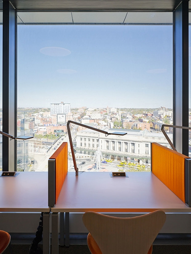 „Beide Leuchten haben ein sehr ansprechendes Design und passen hervorragend zu der fortschrittlichen, nachhaltigen Architektur des Neubaus“, lobt Behnisch das Leuchtendesign. Die University of Baltimore erhielt für das neue John and Frances Angelos Law Center das LEED-Zertifikat in Platin. Ein ganzes Maßnahmenbündel trägt dazu bei, dass das Gebäude 43 Prozent des Energieverbrauchs eines vergleichbaren Gebäudes einspart. Das Energiekonzept umfasst Bauteilaktivierung, Geothermie und Brauchwassernutzung. Außerdem nutzt das neue Gebäude Tageslicht optimal aus: Verglaste Bürotrennwände transportieren Tageslicht durch die Büros zu den innenliegenden Fluren und reduzieren so den Bedarf an künstlichem Licht.