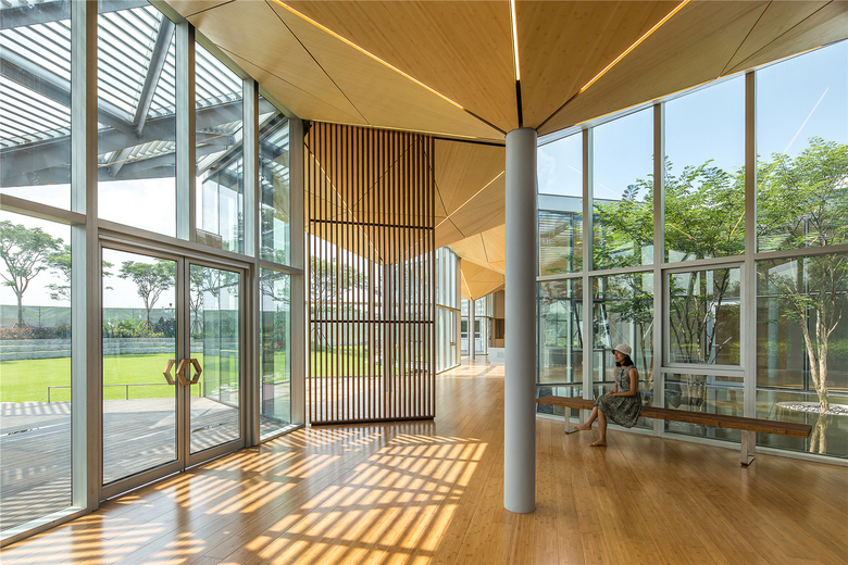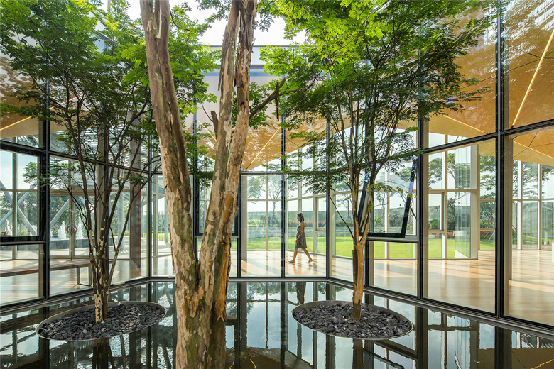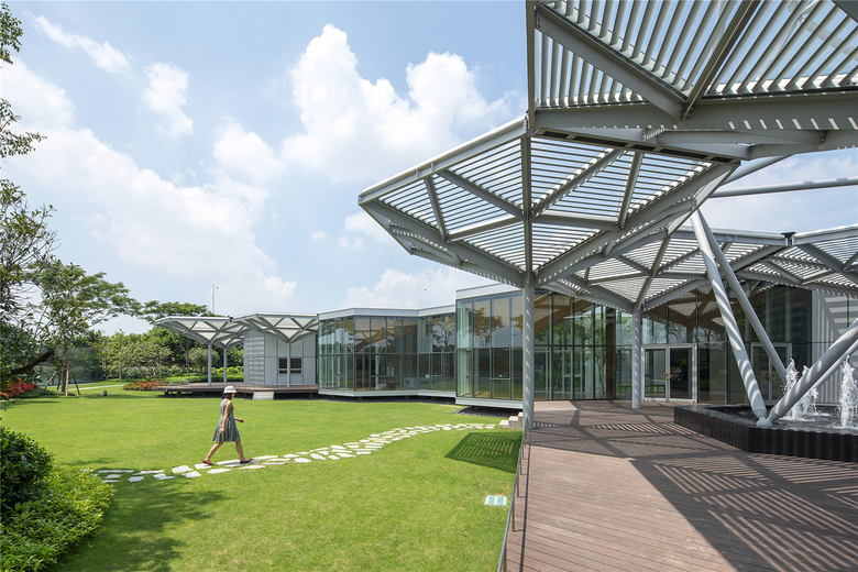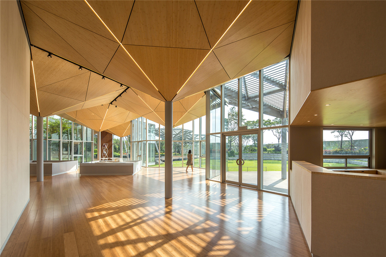 The basic building cell is a 40sqm hexagon module, with an inverted umbrella structure standing on a single pipe column that double functions as the rain flue. Rainwater is collected and used for landscape irrigation. 3 types of cells are created, indoor-open, indoor-closed and outdoor-open, to accommodate different functional needs. The exterior façade is made of unitized curtain wall system. In order to maximize the recyclability and reusability of the building components, all connection details are designed to be reversible, no welding or glue allowed. The pavilion structure sits on top of independent piles, floating above the existing parkland, while the minimal excavated soil is used to form the landscape mount, which frames an open space for public events.