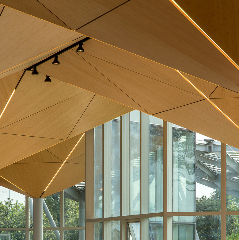 Sandblasted and anodized aluminum panels are used for exterior cladding because of durability and low maintenance. Bamboo, the rapidly renewable material, is used throughout the interior spaces wherever wood is needed.