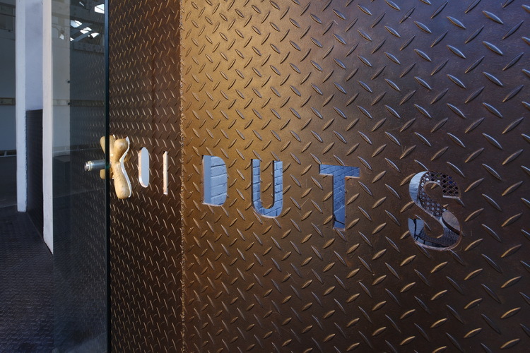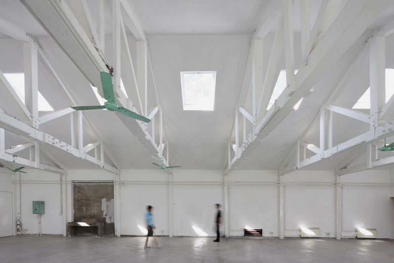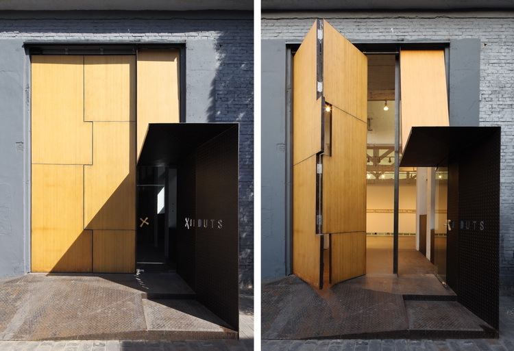 After reconstruction, some traces from the industrial age in the warehouse were selectively preserved, including the concrete wash tub, electrical ceiling fans, wooden door and a number of power outlet boxes. As interesting contrasts to the rawness of the large open space, some intricate new details were added deliberately, such as foldable western entry door(s), expanded south door inspired by structure of airplane wings; X shaped door handle that interlocks with the carved-out text on the standing steel plate, and so on.
