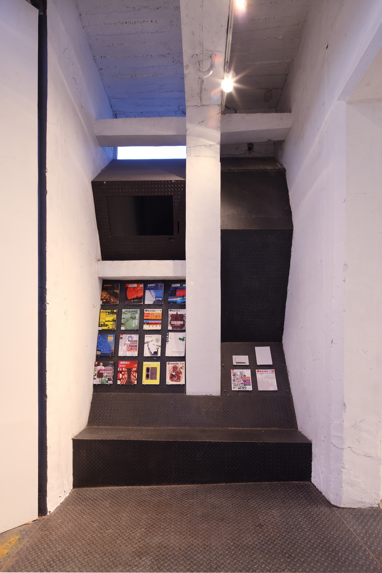 The foyer is situated under the flat roof portion. In order to keep the ventilation function for underground tunnels, a space liner made of patterned steel plates were inserted into the foyer. This inner layer covers up the deep pit thus becomes the new ground surface, and continues to rise up in an undulating manner to form a new vertical surface. The gap between steel plates and the original wall allow air from basement to vent out. The undulating steel plate surface serves as exhibition area for special collections of the bookstore. An LED screen embedded in the steel plate is a multi-media exhibition interface, connecting to other Studio Xs located worldwide.