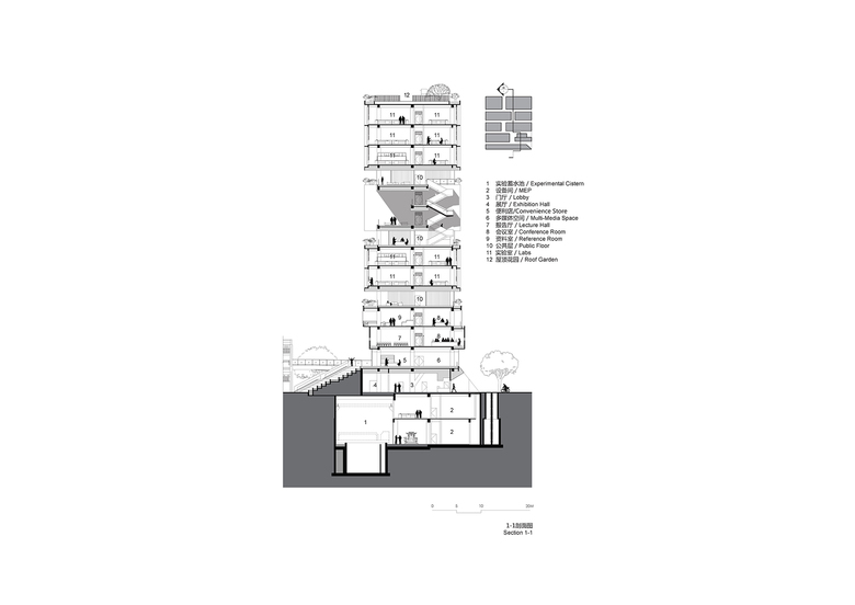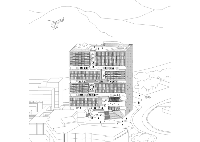 The design takes the organization of public spaces within the overall campus as a starting point. Instead of terminating the campus' main axis on the plan, the building folds the axis to extend it upwards, with abundant public spaces injected along the way. The conventional quad typology for university campuses is re-interpreted here, to form a lively vertical quad system. Meanwhile, the semi-autonomous yet interdependent relationship among the research centers can be visualized in this vertical campus - a shared public level is sandwiched in between every two research centers. Conference room, brain-storming area, exhibition space, study rooms, cafés and other facilities can all be found in these shared levels. Furthermore, within each research center, the labs and offices are separated by a vertical gap, with stairs connecting different horizontal and vertical public spaces together. As time goes by, the plants in these shared spaces will flourish and extend the greenery on the ground all the way up to the roof garden at 60-meter high. The roof garden has a small open air theater which will be a very special panorama viewing platform in the campus, where one may not only enjoy the views of distant mountains and changes of the sky, but also glimpses of giraffes in Shenzhen Wildlife Zoo not too far away.