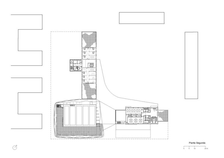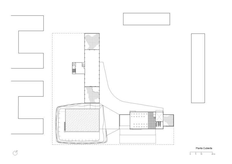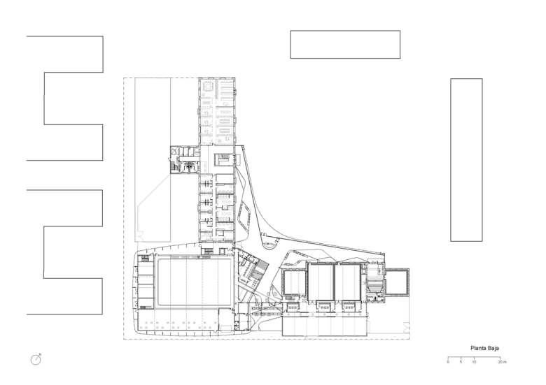 This project gives a new use to the existing buildings that form the old parade courtyard. In order to complete the functions of the centre, a third new volume has been constructed. It hosts a filming studio which is placed in the southern angle of the square and is oriented towards south. A stretched textile forms the envelope that covers this container and it extends evoking the fog that embraces and connect the three buildings. The access is made on the concave part of the façade.