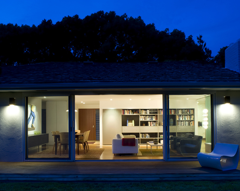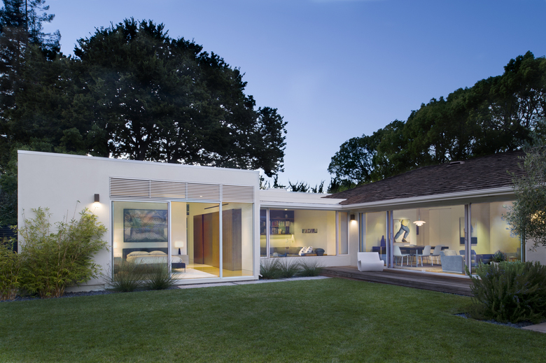 On a tree-lined site in Menlo Park, a 1960s ranch house becomes a polished home that embraces the indoor-outdoor possibilities of life in California. On approach, the house is humble, its low-pitch hip roofs extending past the facade walls to create shallow brows that shade the front of the house. As a stone path slips by the protruding garage volume, a modestly scaled entrance emerges. On this side of the house, there are few apertures; entrance into the interiors reveals an L-shaped glazed expanse that connects the living spaces with the verdant landscape in the backyard.