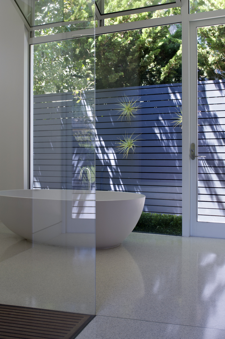 The backyard landscaping is open to both the main living space and the more intimate bedroom, while ceiling-hung curtains stretch across the glass to provide privacy when needed. The home turns inward in the serene, private experience of the owner’s bathroom, where the warmth of the delicately spaced wood shower floor grate and tall closet doors come together with dramatically veined gray marble and subtly speckled cream terrazzo, creating a soothing and tactile experience.