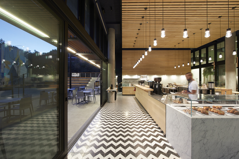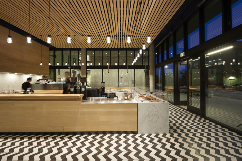At Noon All Day, a relaxed restaurant and café in San Francisco’s Dogpatch neighborhood, refined materials come together with playful details to create a space that allows for both a quick and casual afternoon pick-me-up as well as more laid-back, long lunches. Tile flooring traces a zig-zag black-and-white pattern across the entire space, marking a lively rhythm that reflects the activity on the surrounding streets. Overhead, thin strips of warm wood barely spaced apart set a slower pace and make a drop-ceiling from which Edison-bulb pendants hang, following the perimeter of the service counter.