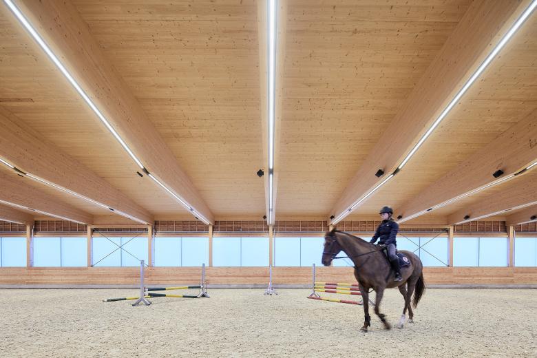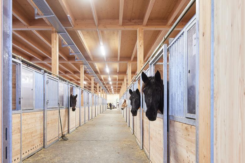 Das Gebäude des Pferdebetriebes wurde im nordöstlichen Bereich des Baufeldes im direkten Bezug zum bestehenden Hof der Landwirtschaft und zur Remise angeordnet. Dadurch können bestmögliche Synergien im Betrieb genutzt werden. Die Reithalle im Osten und die Ställe im Westen sind im Norden durch einen Zwischentrakt und im Süden durch eine überdachte Verbindung verbunden. Die Zugänge zur Reithalle erfolgen über die Längsseite jeweils vom Zwischentrakt sowie über die überdachte Verbindung. Der Zuschauerbereich im Süden der Halle wurde im Nahebezug zum Reitplatz angeordnet. Im nördlichen Zwischentrakt zwischen Stall und Reithalle befinden sich Waschbox und Sattelkammer.