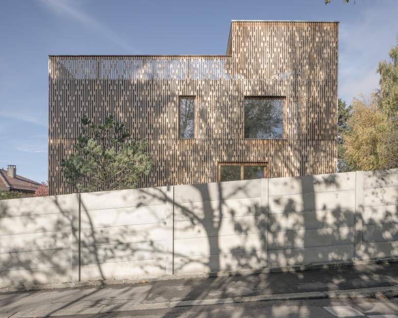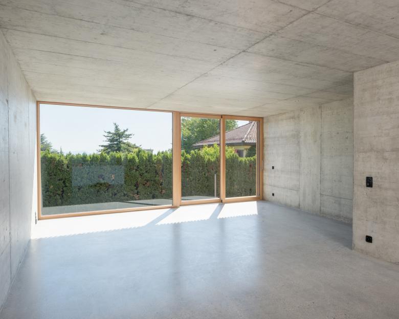 Les matériaux sont laissés bruts est leur nombre réduit au minimum : du béton apparent à l’intérieur, du bois à l’extérieur pour l’essentiel. L’ambiance et la richesse aussi bien intérieures qu’extérieures sont obtenues par l’assemblage, la mise en œuvre et le traitement de ces matériaux : un béton calepiné pour les murs, des dalles poncées révélant des agrégats, un clairevoie soigneusement dessiné en façade qui revisite le bardage vertical traditionnel. Ces choix simples et radicaux obéissent aussi à une cohérence énergétique et constructive : les dalles actives transmettent de manière optimale la chaleur, le dessin de la clairevoie a permis au charpentier de préfabriquer entièrement la façade en atelier et optimiser la pose sur le chantier.
