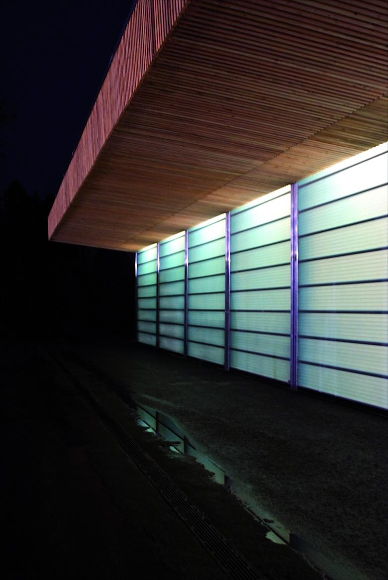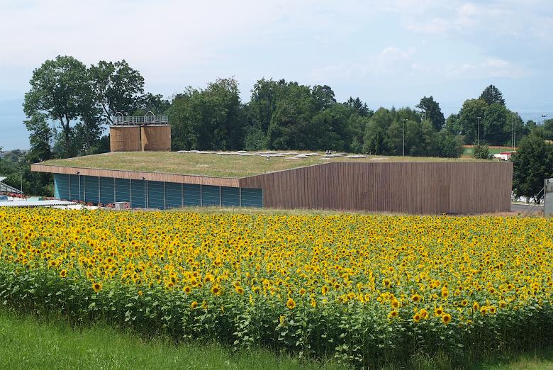 L’enveloppe est réalisée en panneaux agglomérés isolants en façade et en toiture, et les façades nord et sud sont recouvertes d’un lambris à claire-voie. D’autres aspects liés au développement durable caractérisent la réalisation: performance Minergie pour la partie chauffée, panneaux solaires, récupération d’eau de pluie.