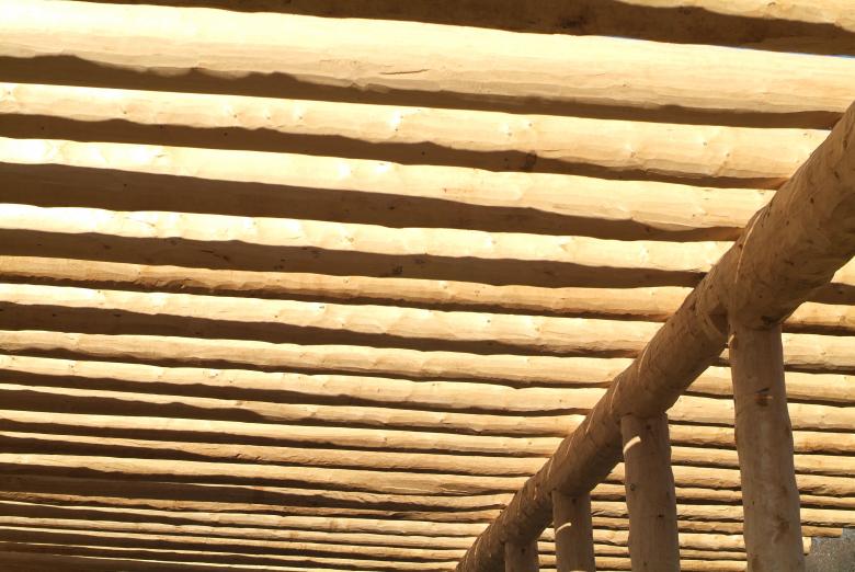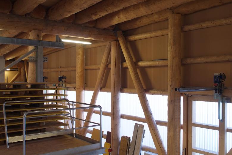 La structure de la halle est entièrement réalisée en bois rond, avec des chevrons d’un diamètre de 60 cm, posés sur des rangées de poteaux supportant une filière. Très simple et robuste, cette technique se révèle optimale du point de vue financier et environnemental, générant un minimum de façonnage et limitant les déchets et «l’énergie grise» (le bois étant récolté dans les forêts environnantes). A l’Ouest, la partie chauffée (vestiaires, ateliers, cafétéria, bureaux, logements) a une structure en bois équarri avec remplissage en brique (type colombage/ Riegelwerk) ou revêtement en plâtre.