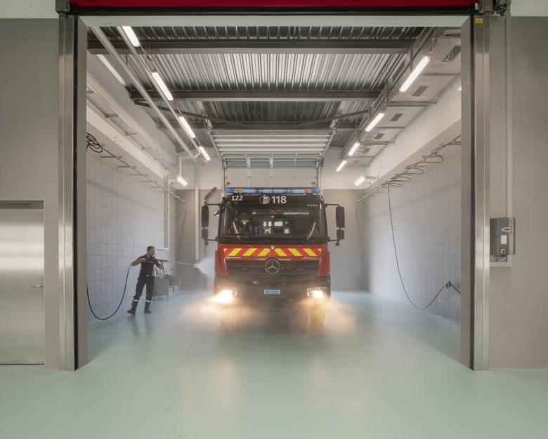 Pour répondre au mieux aux besoins de ces utilisateurs, la caserne est aménagée en deux parties : une halle tempérée proposant des espaces de grandes hauteurs (structure acier/béton) et une tête chauffée (structure béton) organisée sur 2 niveaux.