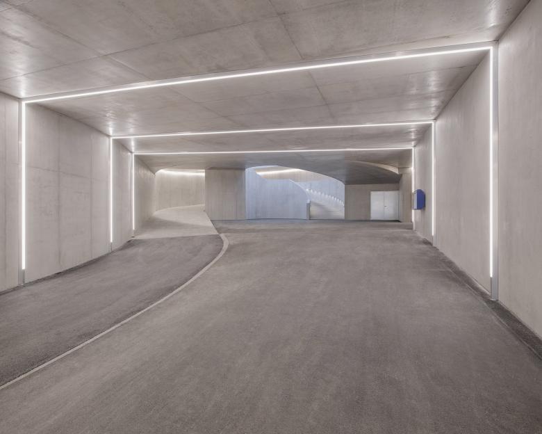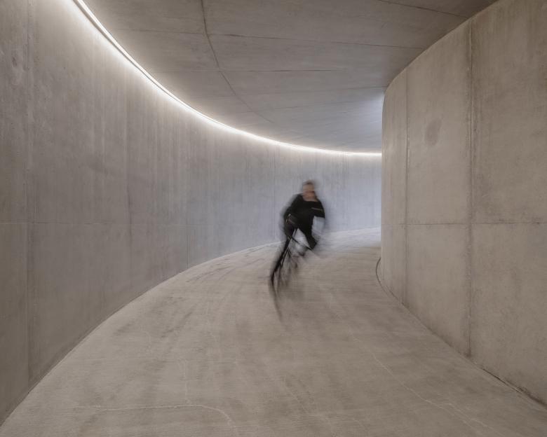 Entirely made of neat exposed concrete, the passage is formed by a double helical ramp with a radius of 10 meters extended by a 60-metre-long straight underpass. A staircase is located inside the bicycle ramp. Two lifts complete these passages for people with reduced mobility.
