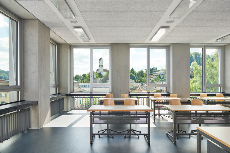 Der Mehrzweckraum mit dem Foyer im Erdgeschoss ist ausgerichtet auf den neuen Parkraum und stellt die Verbindung von der Schule zur Öffentlichkeit her. Die voluminöse Treppe in Form einer Doppelhelix mit zentralem Lichthof funktioniert durch ihre vertikale Erschliessung als verbindendes Element aller Geschosse und wird zur Begegnungszone für Kinder und Lehrpersonen. Der Schulbetrieb spielt sich in den drei Obergeschossen ab. Mit acht Klasseneinheiten pro Stockwerk ergeben sich überschaubare räumliche und funktionale Einheiten. Dank grosser Flexibilität in der Raumeinteilung sind vielfältige, auch grossflächige Nutzungen möglich, die an unterschiedliche Schulkonzepte angepasst werden können. Mit Linoleumböden sowie abgehängten Decken, Einbauten in Fensternischen und Zwischenwänden aus Holz vermitteln die Zimmer eine wohnliche Atmosphäre.